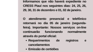 Aviso de expediente! !!Em razão dos feriados e pontos facultativos estadual e municipal, informamos que não haverá expediente na sede do CRESS Piauí